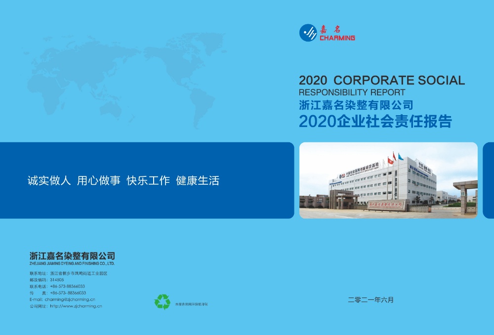《浙江嘉名控股有限公司2020企業(yè)社會責任報告》本著客觀、透明、誠信、規(guī)范的原則編寫,從責任管理、誠信建設、價值創(chuàng)造、綠色環(huán)保、安全生產(chǎn)、垃圾分類、員工權(quán)益、黨群工作、企業(yè)文化、社會公益等責任和行動出發(fā),以豐富的內(nèi)容、翔實的數(shù)據(jù)和真實的業(yè)績,全面展示了2019-2020年公司打造實力嘉名、創(chuàng)新嘉名、誠信嘉名、綠色嘉名、和諧嘉名的實踐情況,彰顯了公司為早日實現(xiàn)“致力成為國內(nèi)外知名服裝品牌的首選面料供應商”的嘉名夢的信心和決心,更向社會公眾呈現(xiàn)了嘉名作為一家民營企業(yè)為履行社會責任,推動行業(yè)和當?shù)厣鐣目沙掷m(xù)發(fā)展所做出的努力及責任擔當。