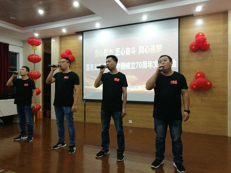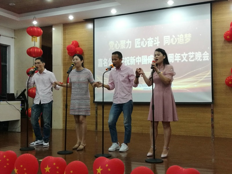今年是新中國成立70周年,又恰逢嘉名建廠25周年。9月28日晚,公司中高層管理者與員工在嘉名員工公寓區活動樓歡聚一堂,自編自導自演了一場熱烈、精彩、別致的文藝晚會,向新中國成立70周年華誕和嘉名建廠25周年獻禮。