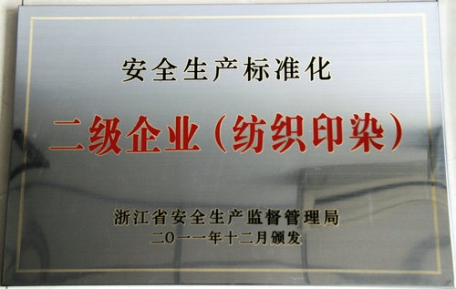 2011年12月,浙江嘉名染整有限公司被浙江省安全生產(chǎn)監(jiān)督管理局命名為安全生產(chǎn)標準化二級企業(yè)